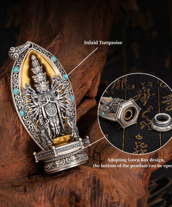 Tibetan Buddhist Thousand-Armed Avalokiteshvara Turquoise Sterling Silver Pendant