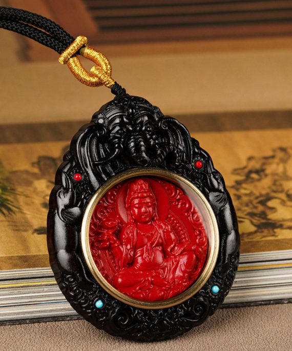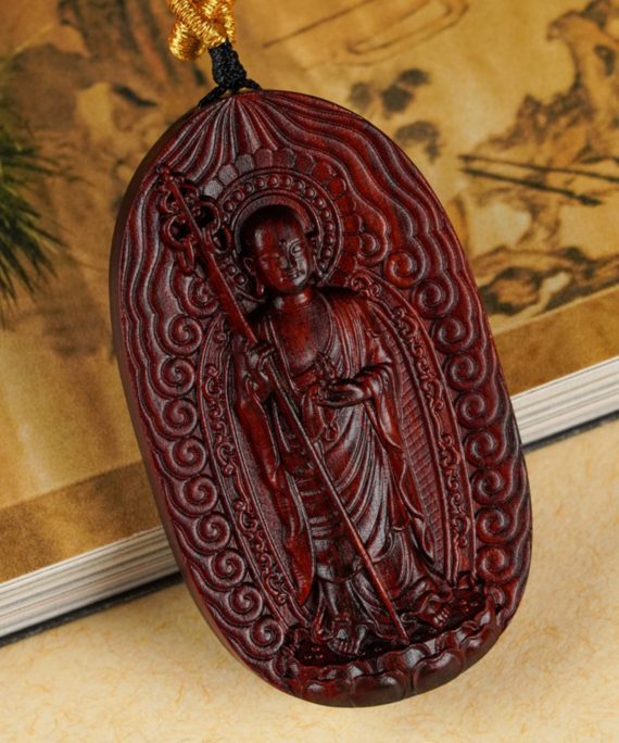 Mysterious gifts Hand-Carved Black Sandalwood and Cinnabar Guardian Buddha Pendant Necklace