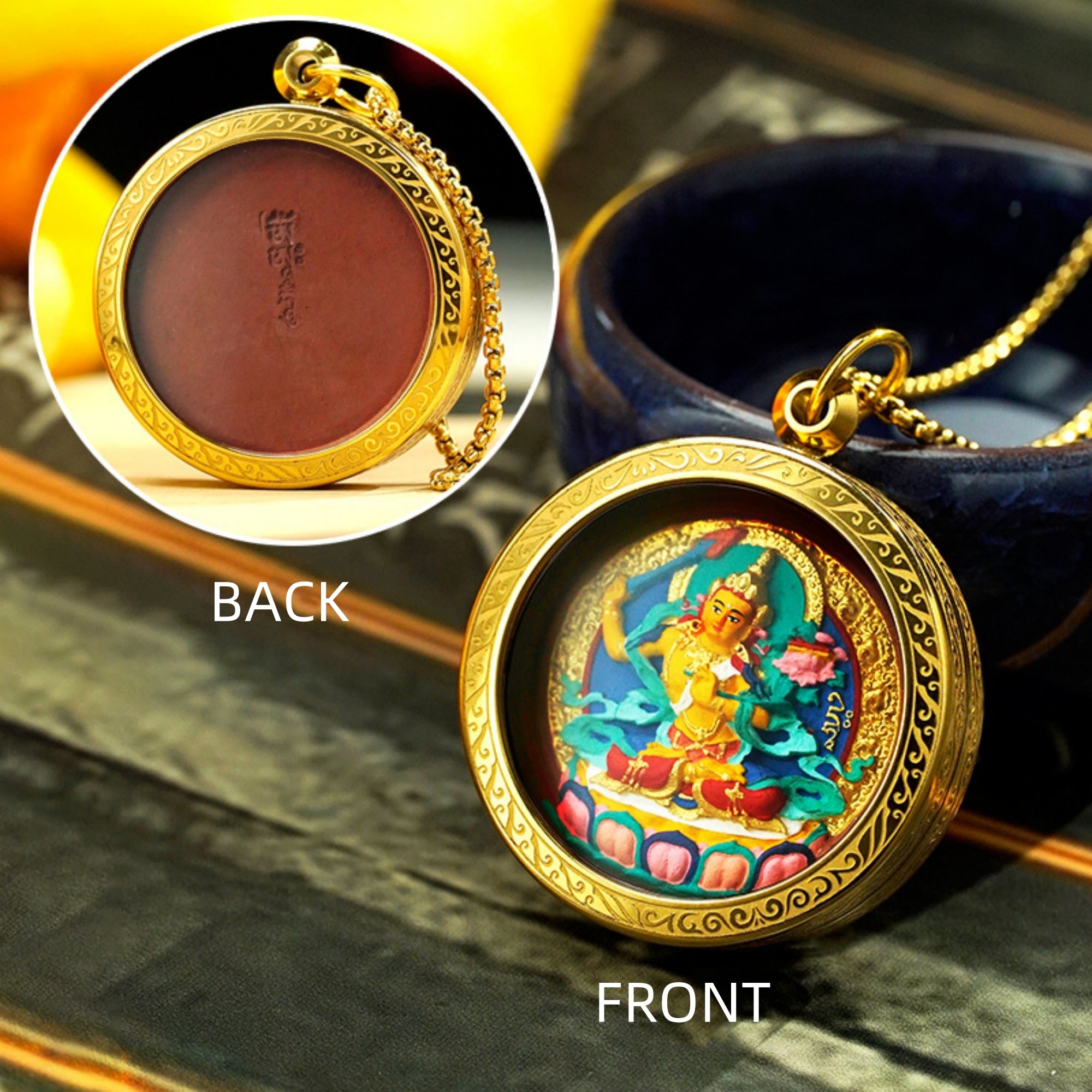 This pendant necklace showcases a hand-painted Thangka of significant deities from Tibetan Buddhism, each with unique spiritual meanings. The Thangka is carefully placed in a brass Gawu Box, a traditional Tibetan container for sacred items. The detailed artistry captures the essence of each deity, making this necklace a symbol of protection and blessings.