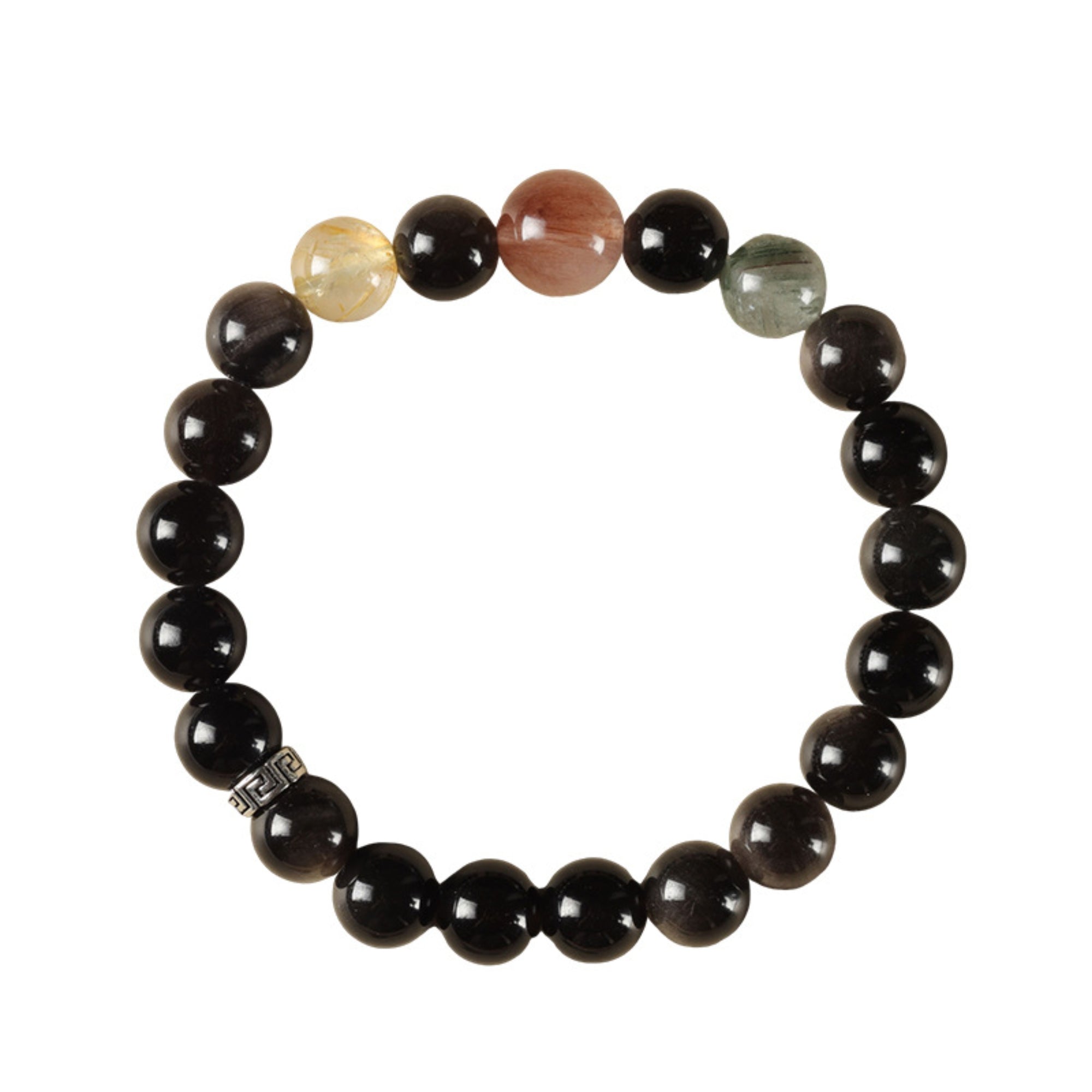 Hand-strung with 8mm natural silver sheen obsidian beads and rutilated quartz accents, this elastic bracelet merges Earth’s raw power with celestial energy. Stretches to fit most wrists – minimalist armor for modern mystics.