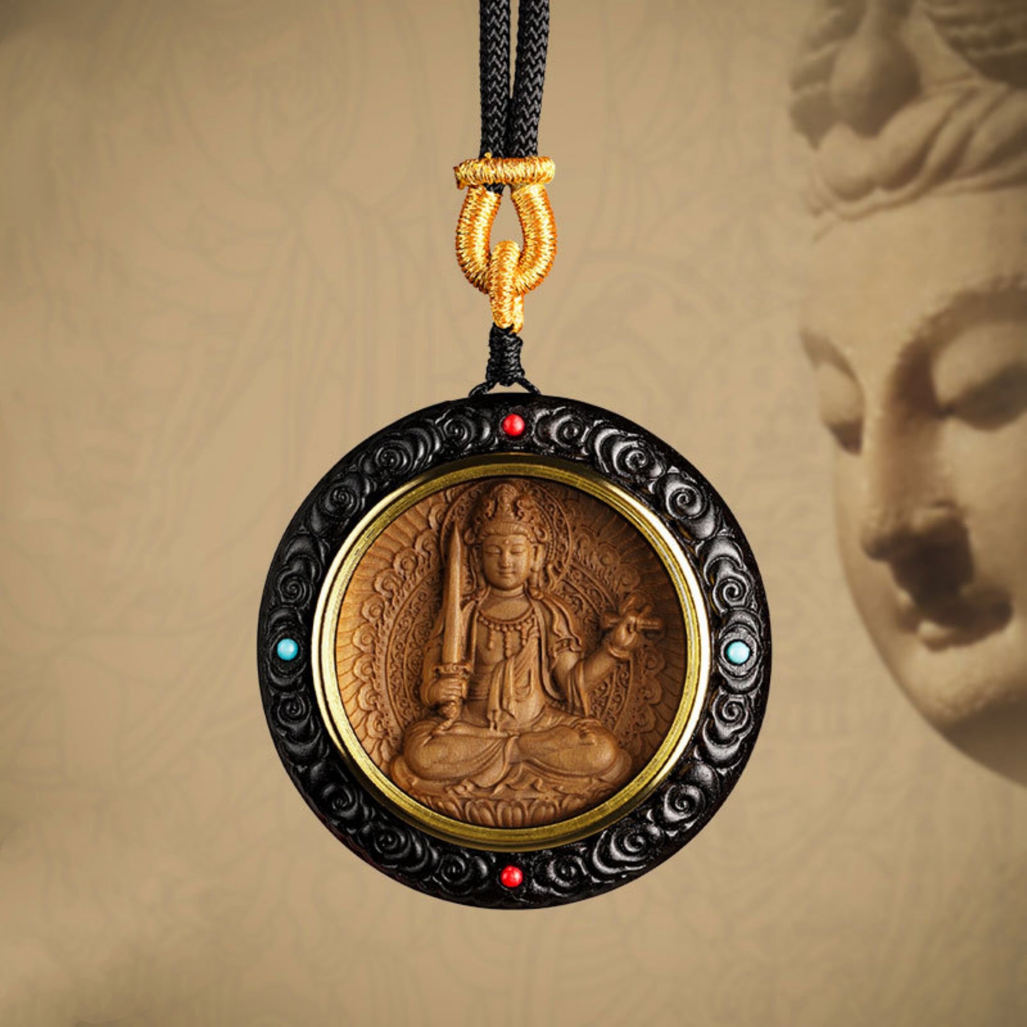 This exquisite pendant necklace features a hand-carved Guardian Buddha crafted from natural black sandalwood and rosewood.