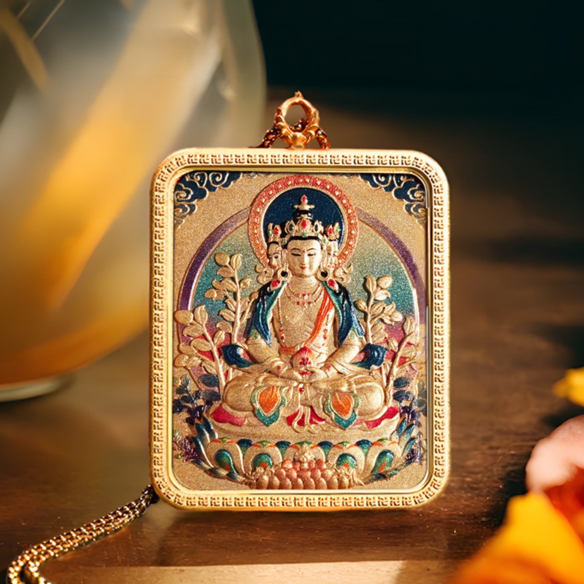 Embrace the spiritual essence of Tibetan artistry with this exquisitely handcrafted Thangka Buddha pendant necklace. The pendant features a detailed 3D relief design. On the reverse side, intricate Ten Auspicious Symbols are carved, believed to enhance the blessings bestowed by the necklace.