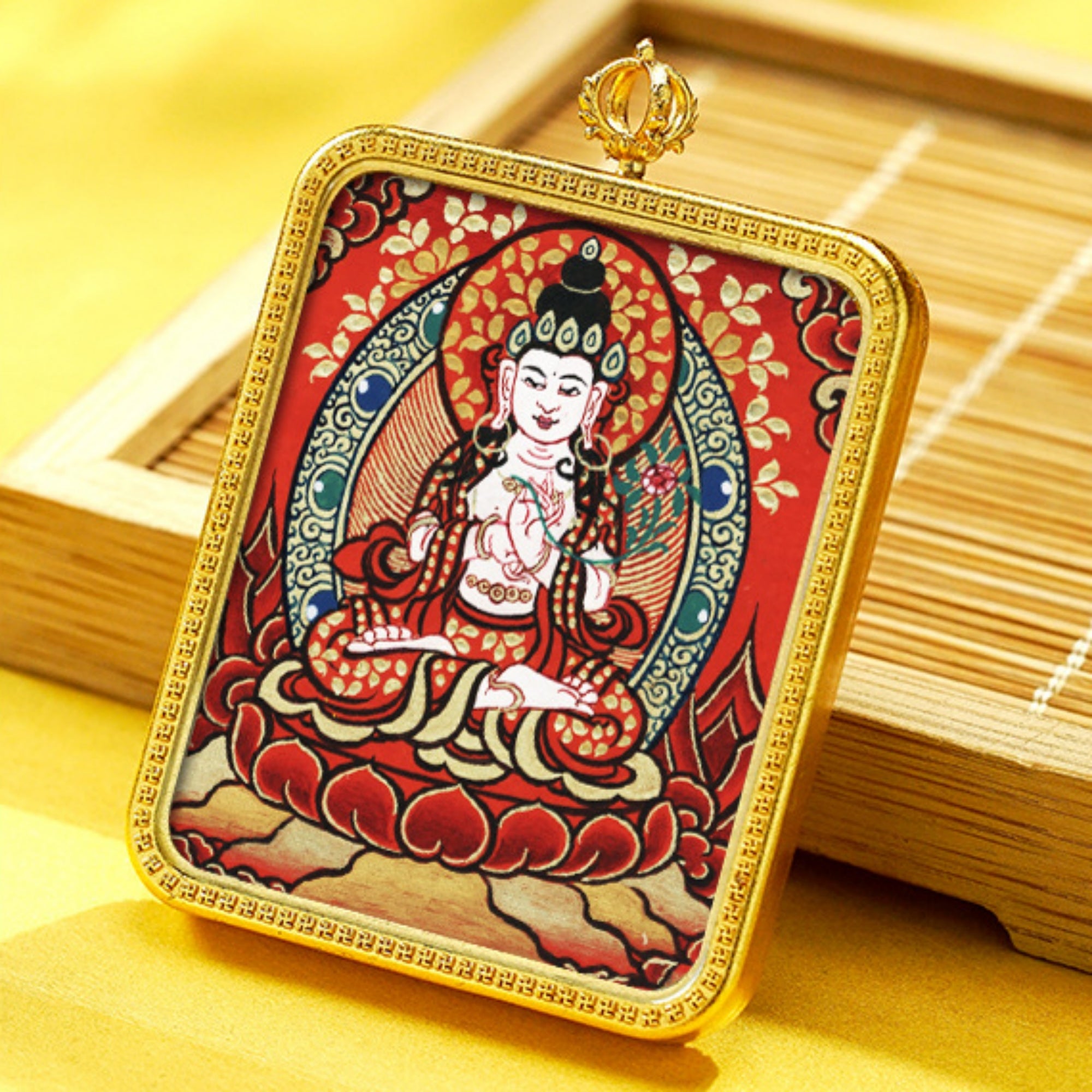 Hand-Painted Thangka: Each pendant is adorned with meticulously hand-painted Thangka, a traditional Tibetan Buddhist art form depicting sacred deities and symbols. These intricate designs showcase vibrant colors that represent the divine.