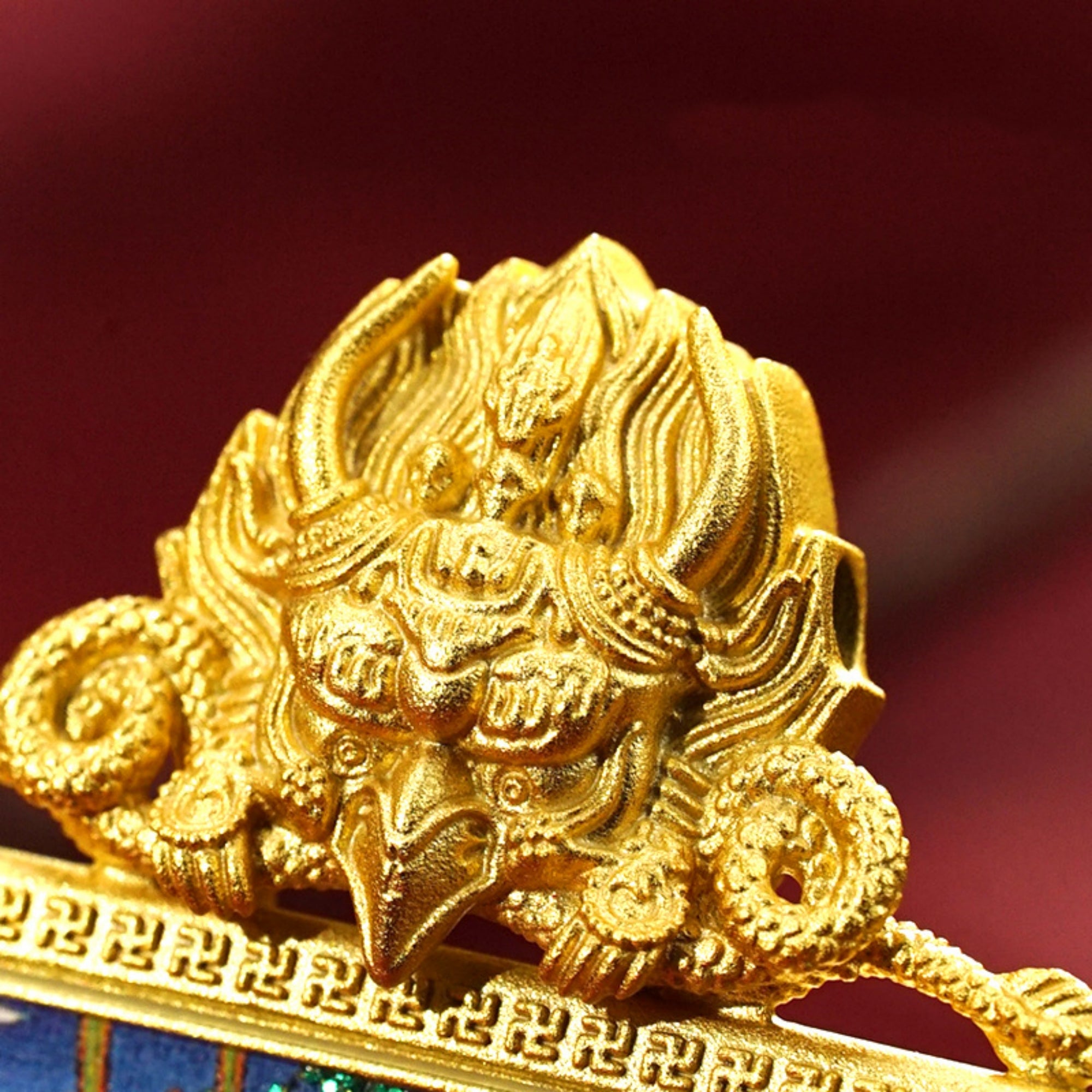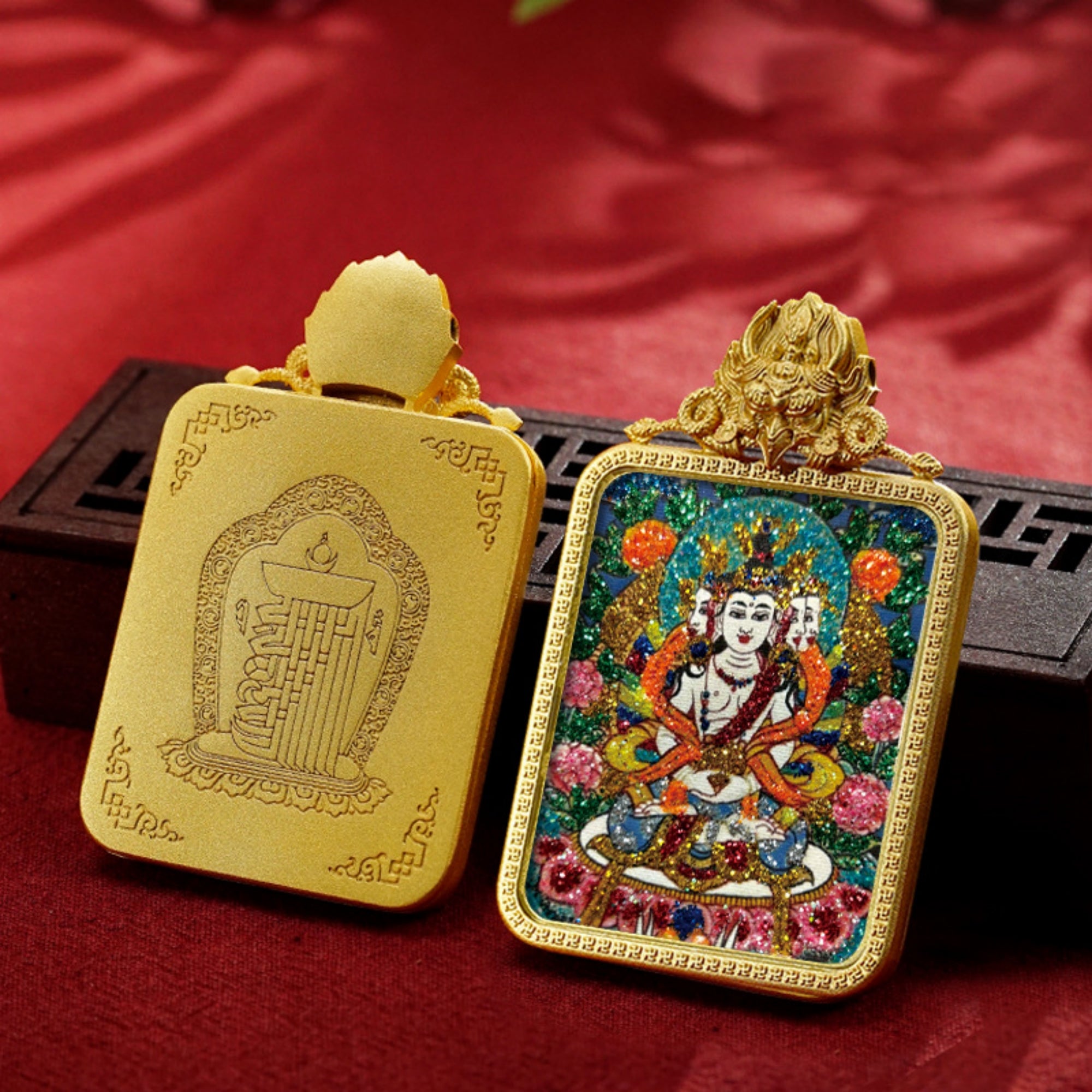 This stunning pendant necklace blends traditional Buddhist symbolism with modern design, featuring a hand-carved, three-dimensional Thangka Buddha motif. The pendant showcases the powerful Garuda bird, a symbol of protection, with intricate engraving of the Ten Auspicious Symbols on the reverse side to enhance its spiritual blessing. The handcrafted colored sand technique adds a vibrant touch, making this piece a perfect combination of sacred art and contemporary fashion.