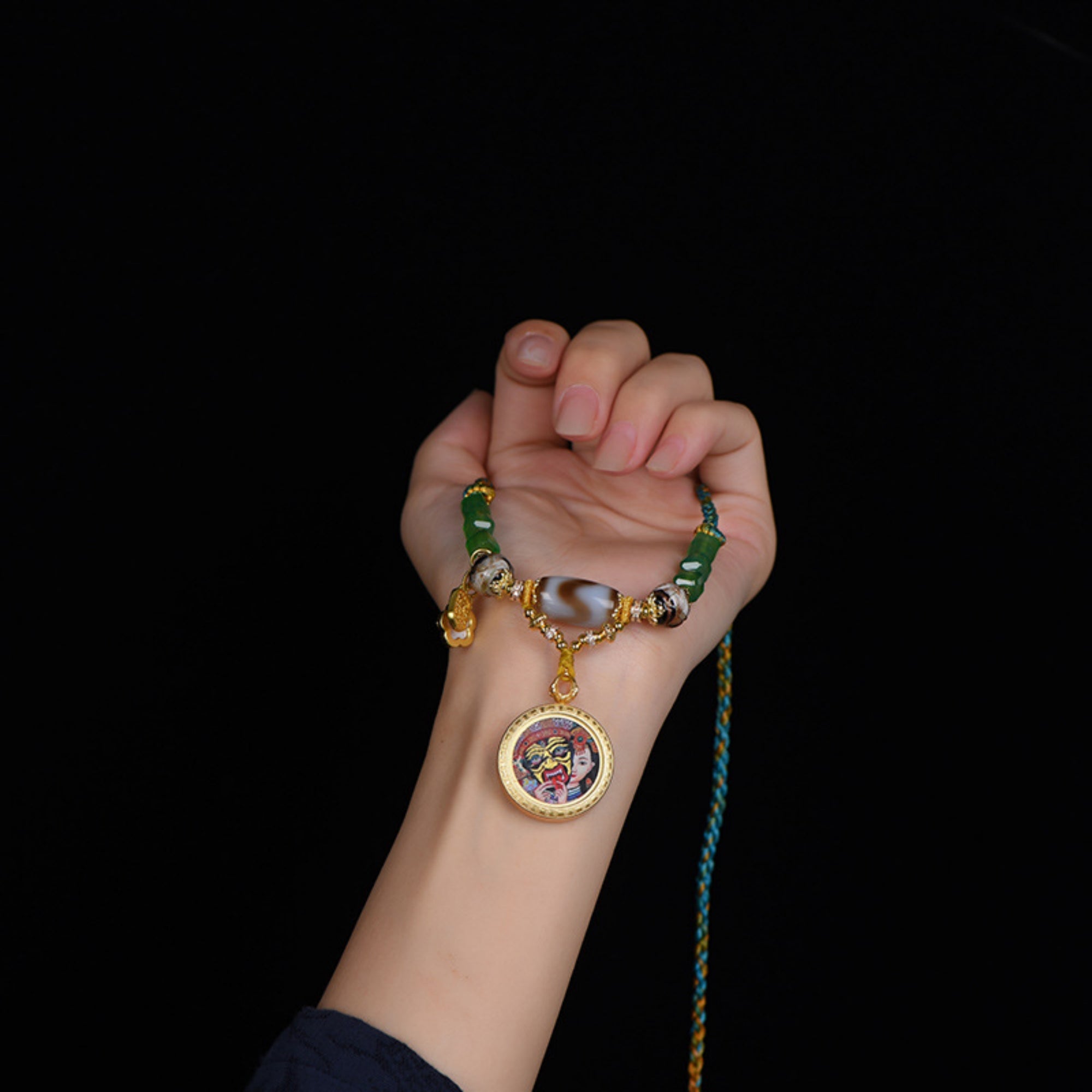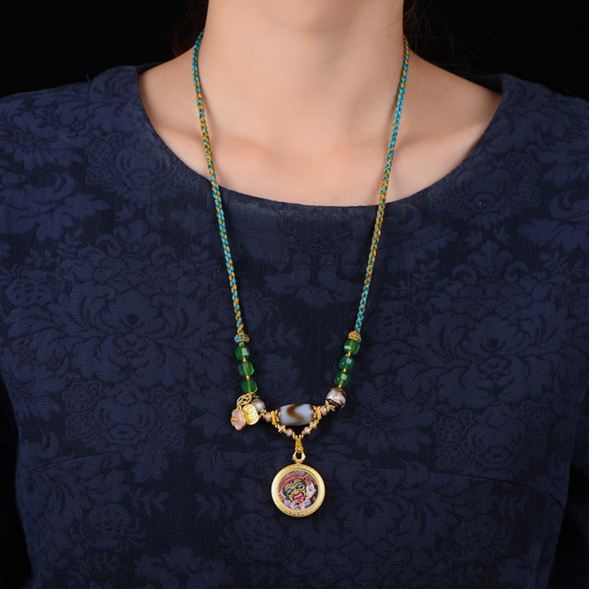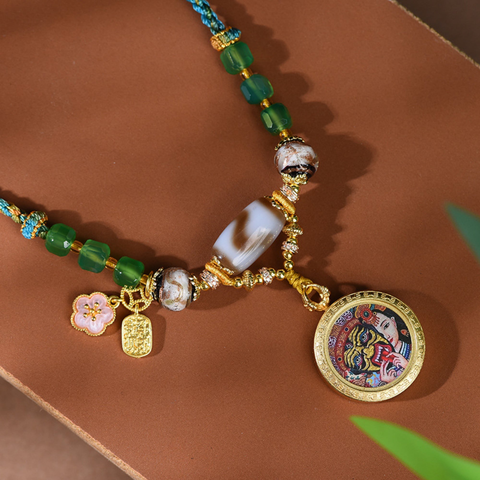 The necklace is created using traditional thangka painting techniques, with each stroke meticulously hand-drawn. Thangkas are traditionally painted with precious minerals and gemstones, ensuring the necklace’s durability and cultural value.