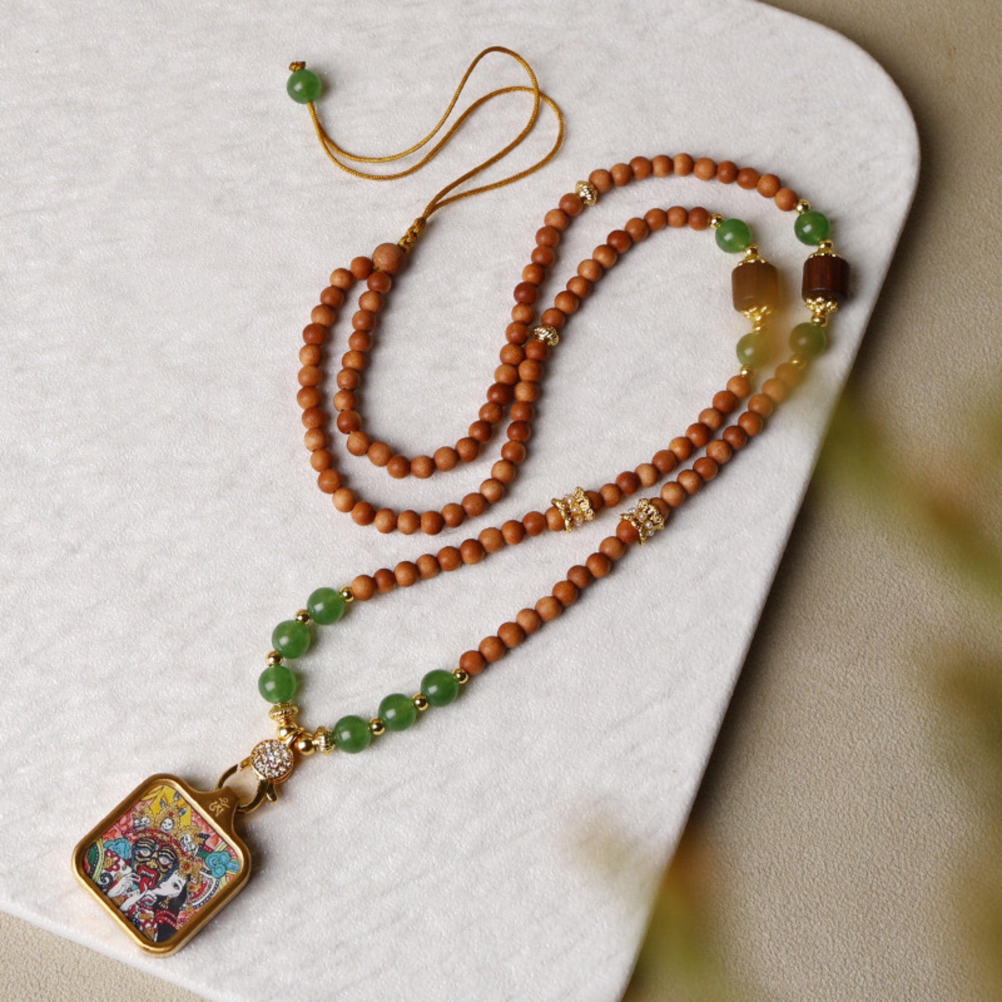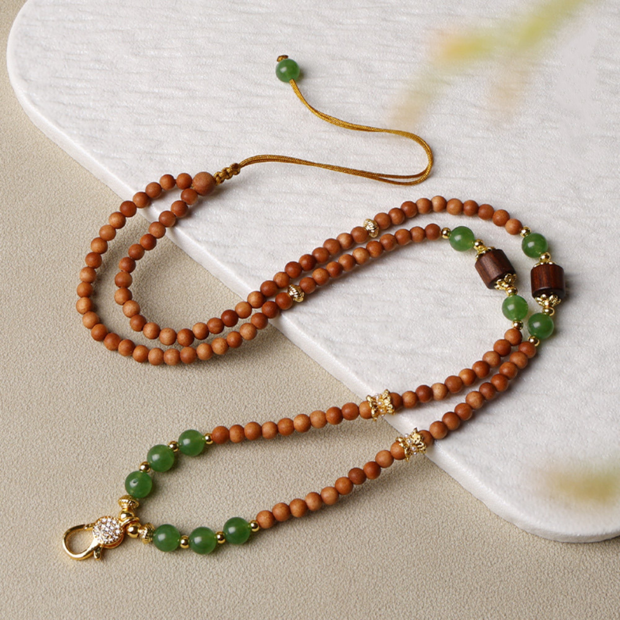 Handcrafted by Tibetan artisans, this refined replacement chain is designed to complement your Thangka pendants with subtle elegance and spiritual depth. Made from smooth 4 mm sandalwood beads and accented with a few natural jade beads, this piece blends tradition and tranquility in every strand.