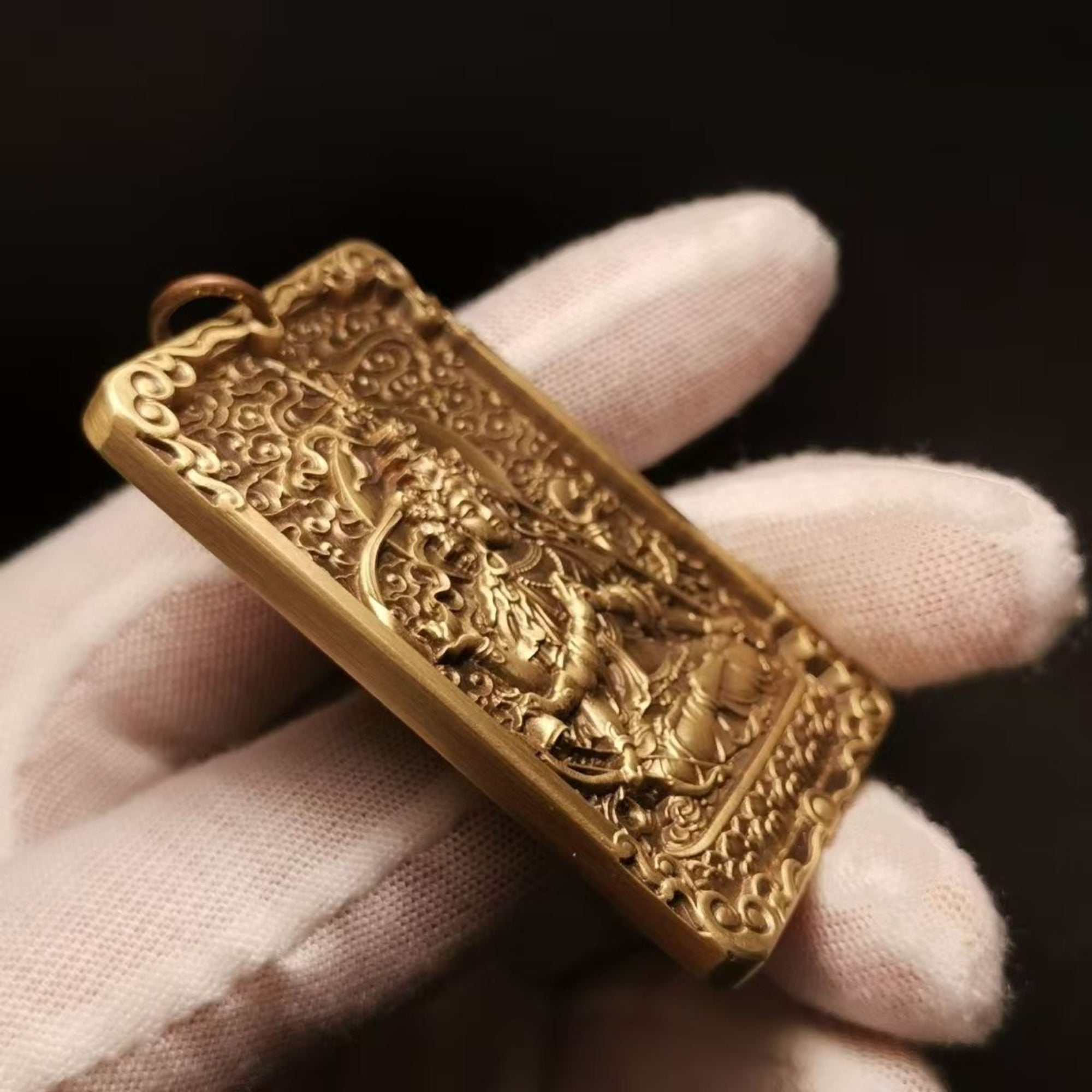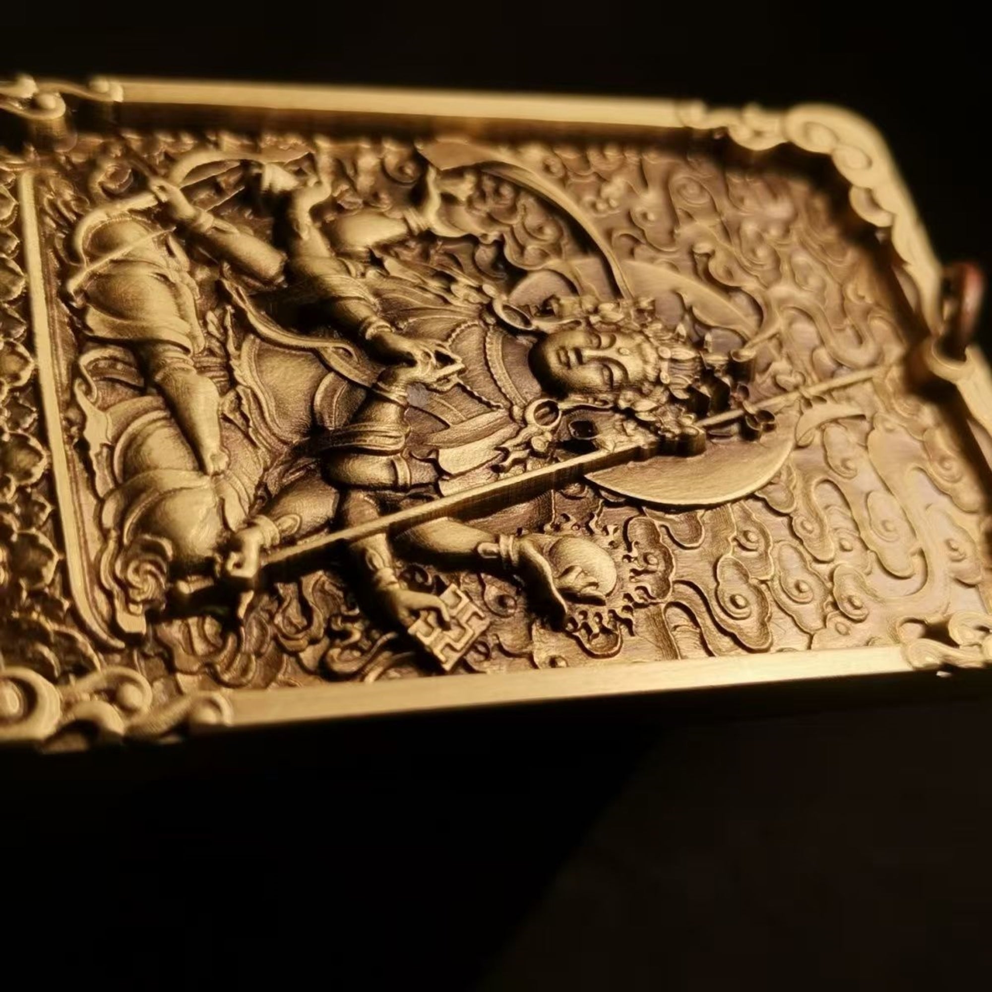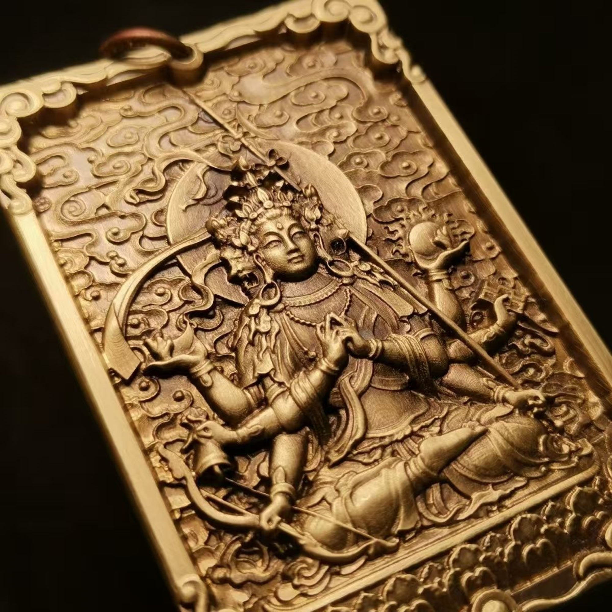 Handcrafted by Tibetan artisans, this talisman-style pendant is cast in warm brass and features a finely carved image of Marici (Marishi-Ten). The reverse is engraved with Marici’s mantra in both Chinese and Tibetan script. Compact and meaningful, it makes a thoughtful gift or a personal amulet for protection, guidance, and clarity.