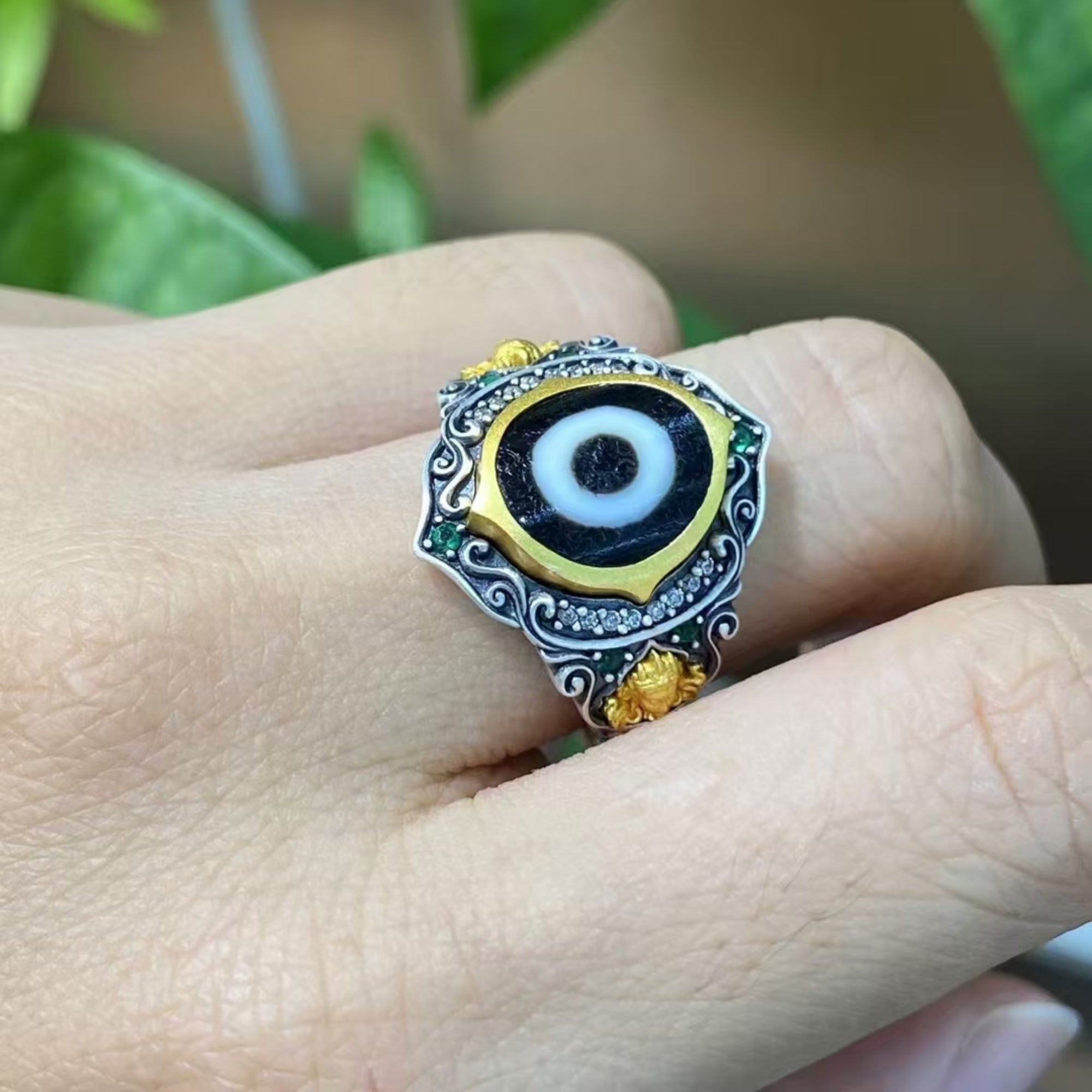 Hand-forged by Tibetan artisans, this Tibetan Buddhist Green Tara Dzi Bead Ring fuses ancient spiritual armor with the life-giving energy of Green Tara. Cast in S925 silver and anchored by a sacred Dzi bead and vivid Colombian emerald, it’s protection made tangible.