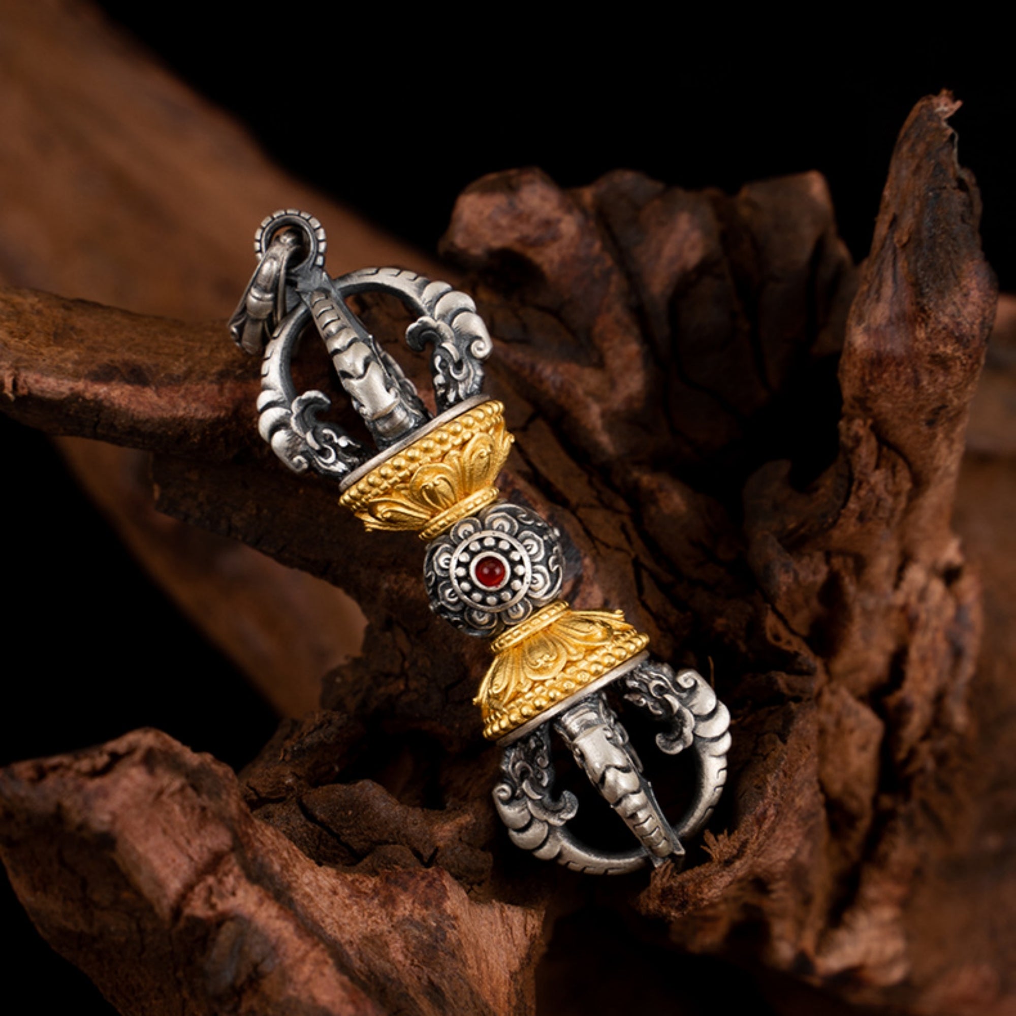 The design of this pendant is inspired by the vajra, a sacred ritual instrument in Tibetan Buddhism symbolizing indestructible strength and spiritual power. The vajra is often used in rituals to dispel negative energies and protect against evil forces. It is a symbol of the Buddha’s wisdom and compassion, and its presence is believed to bring strength and protection to the wearer.