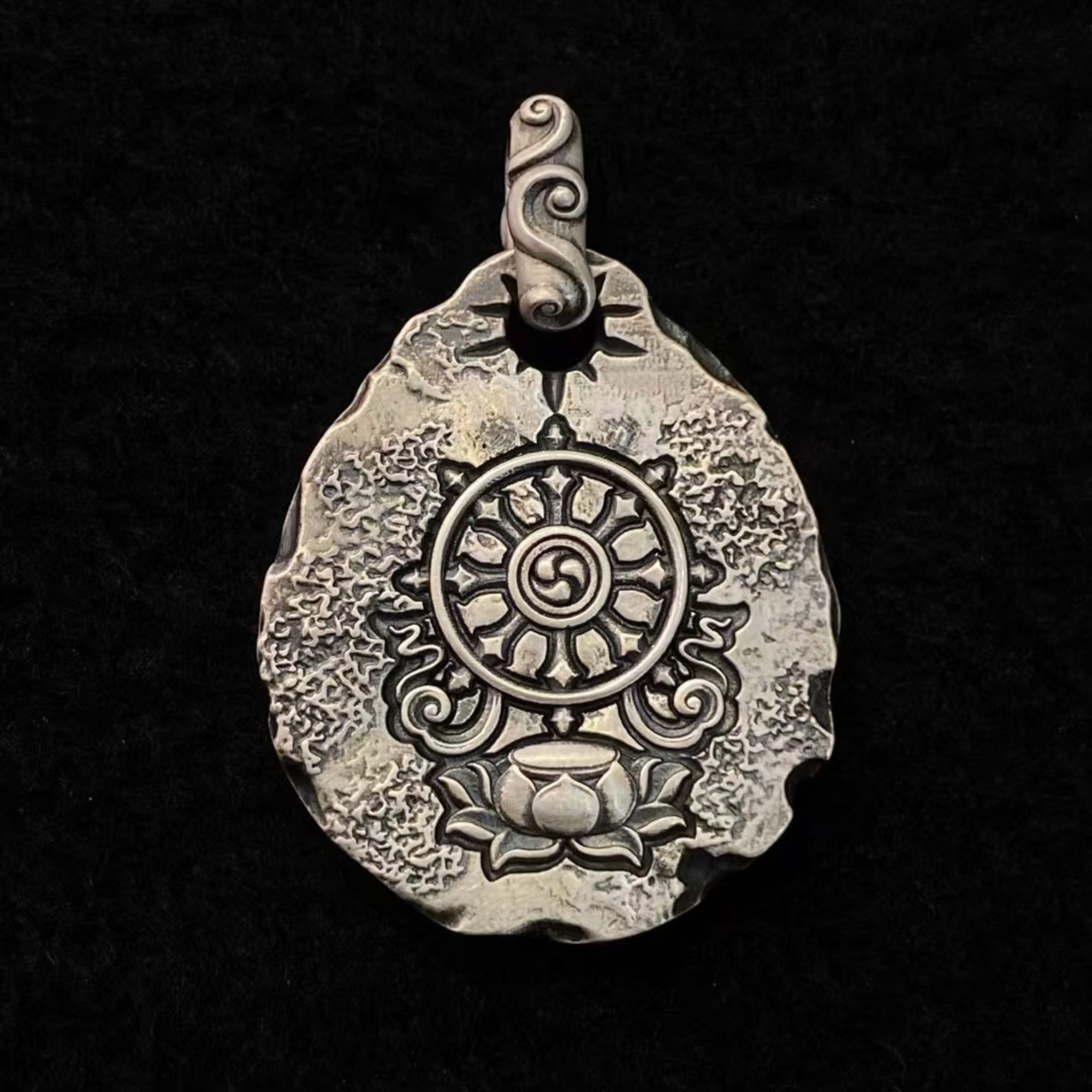 Crafted by Tibetan artisans in S925 silver with gold accents, this 34.5mm amulet features Garuda – mythic conqueror of serpents – soaring above a lotus and dharma wheel. Forged for modern warriors battling invisible chains.