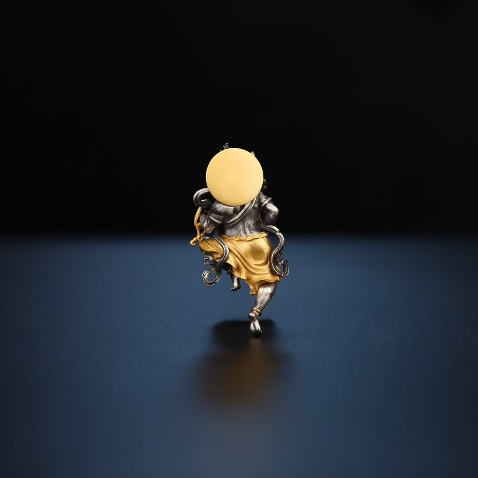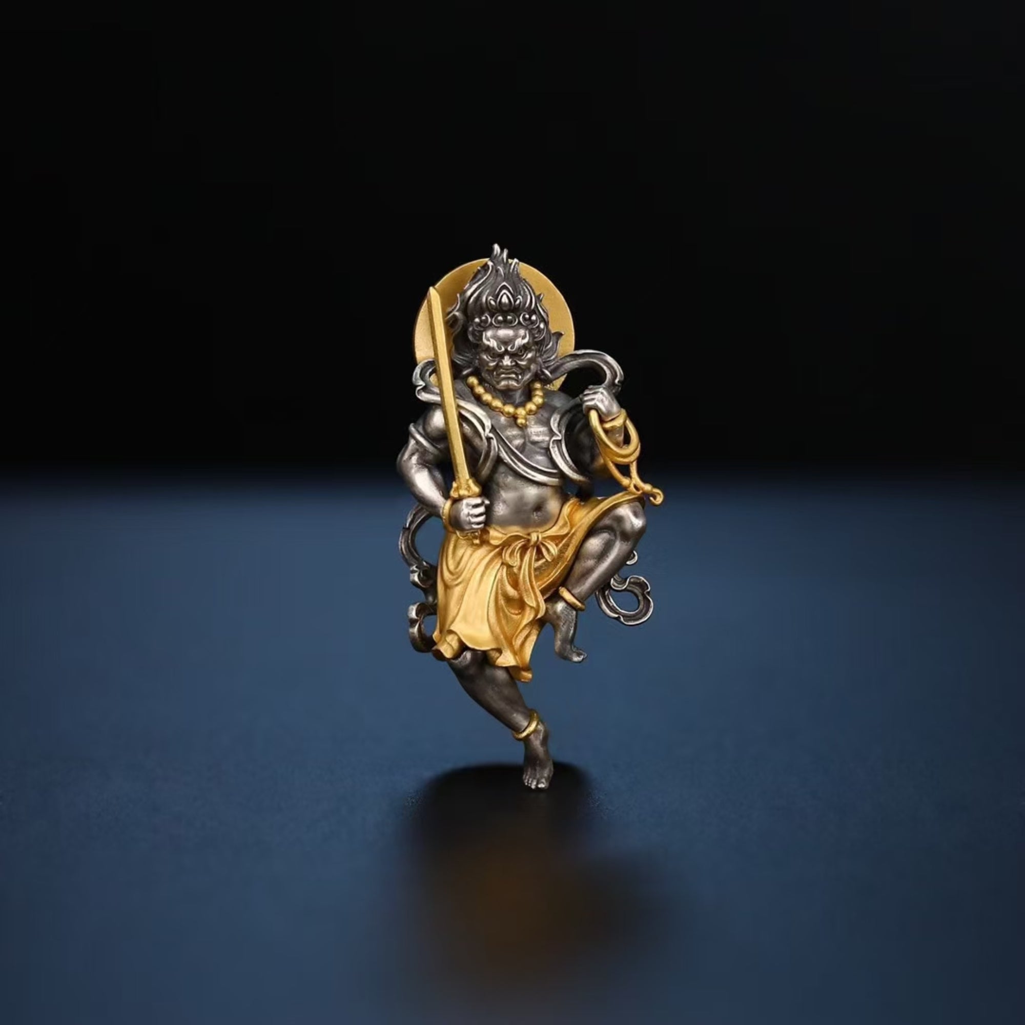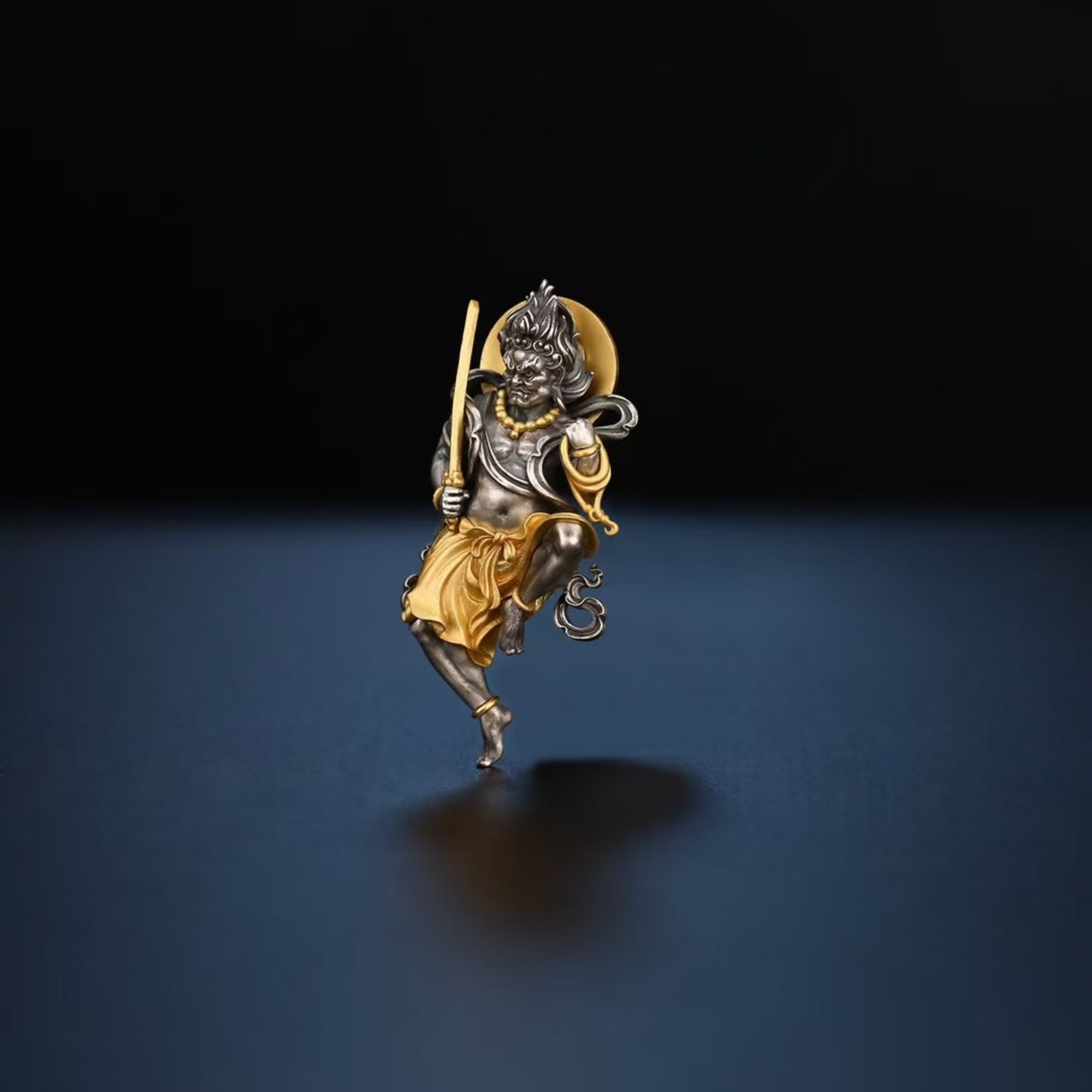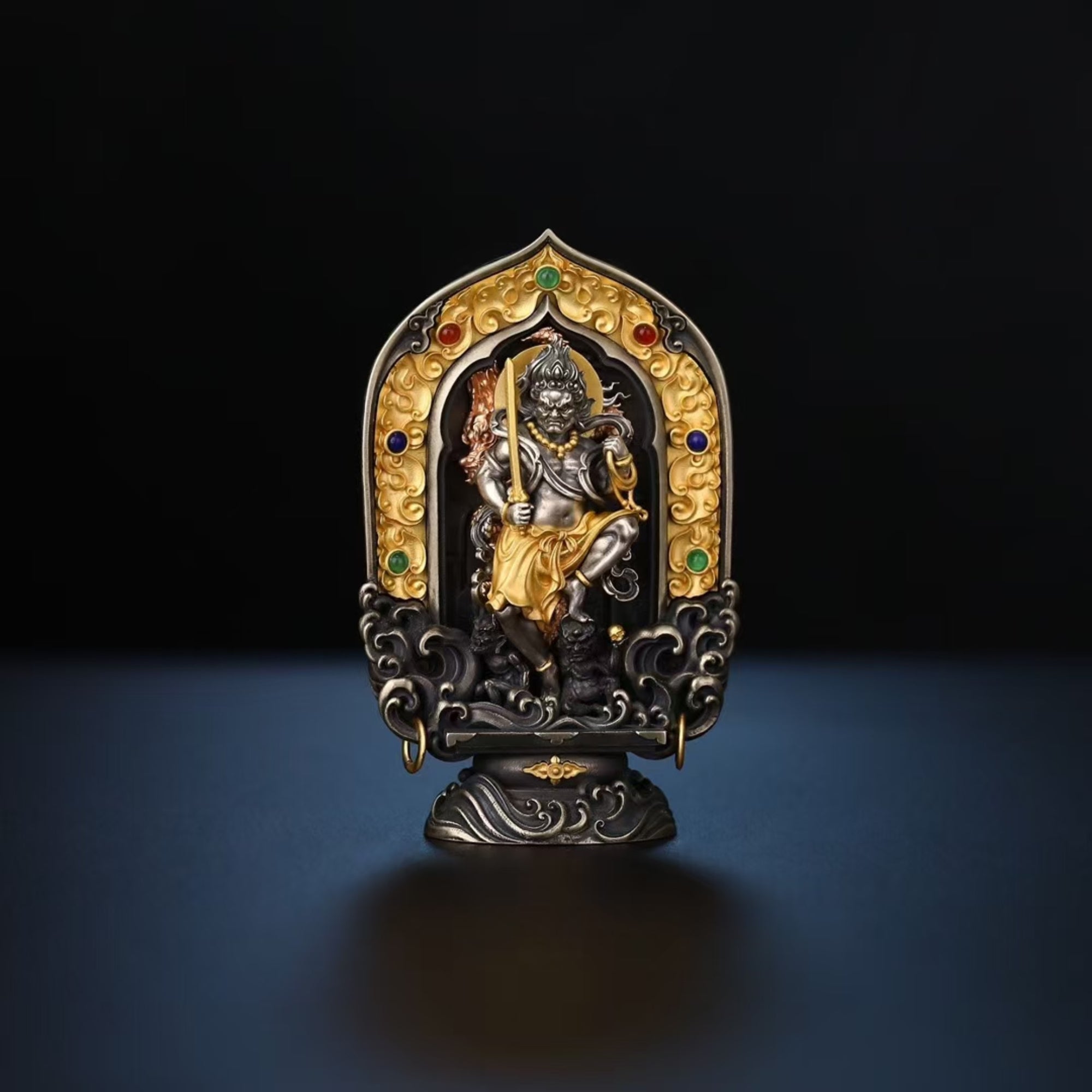 Crafted by Tibetan artisans, this ritual-grade S925 silver shrine statue depicts Acala (Fudo Myo-o) — the Buddhist guardian of unwavering resolve. Featuring partial gold plating and a coiled copper dragon symbolizing cosmic power, the shrine’s base opens to hold sacred items, blending ancient symbolism with functional design.