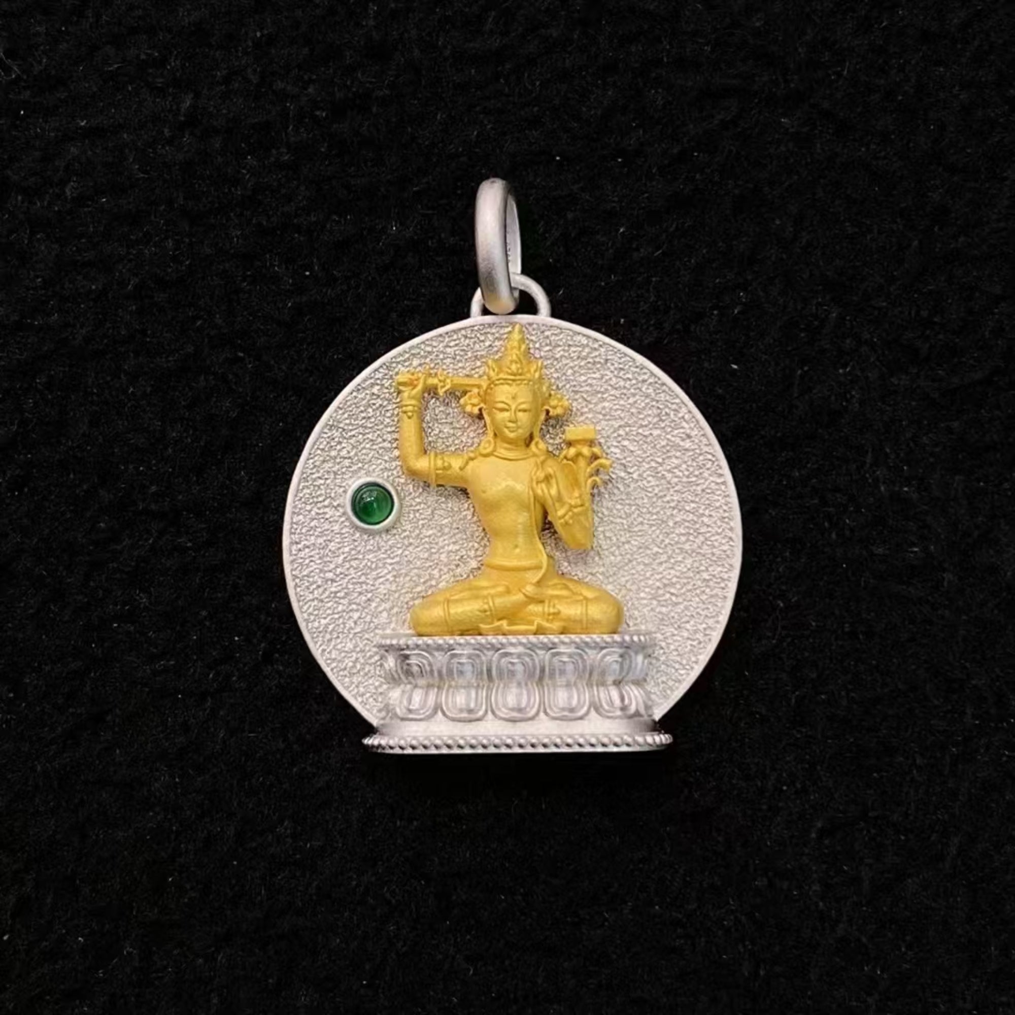 Crafted by Tibetan artisans, this S925 silver pendant features a gold-plated Manjushri carved atop a textured silver background. An emerald rests at the Bodhisattva’s right – symbolizing wisdom’s luminous power – while the reverse bears a vajra thunderbolt and Chinese blessings (Fortune, Abundance, Peace, Fulfillment). Himalayan devotion meets universal aspirations.