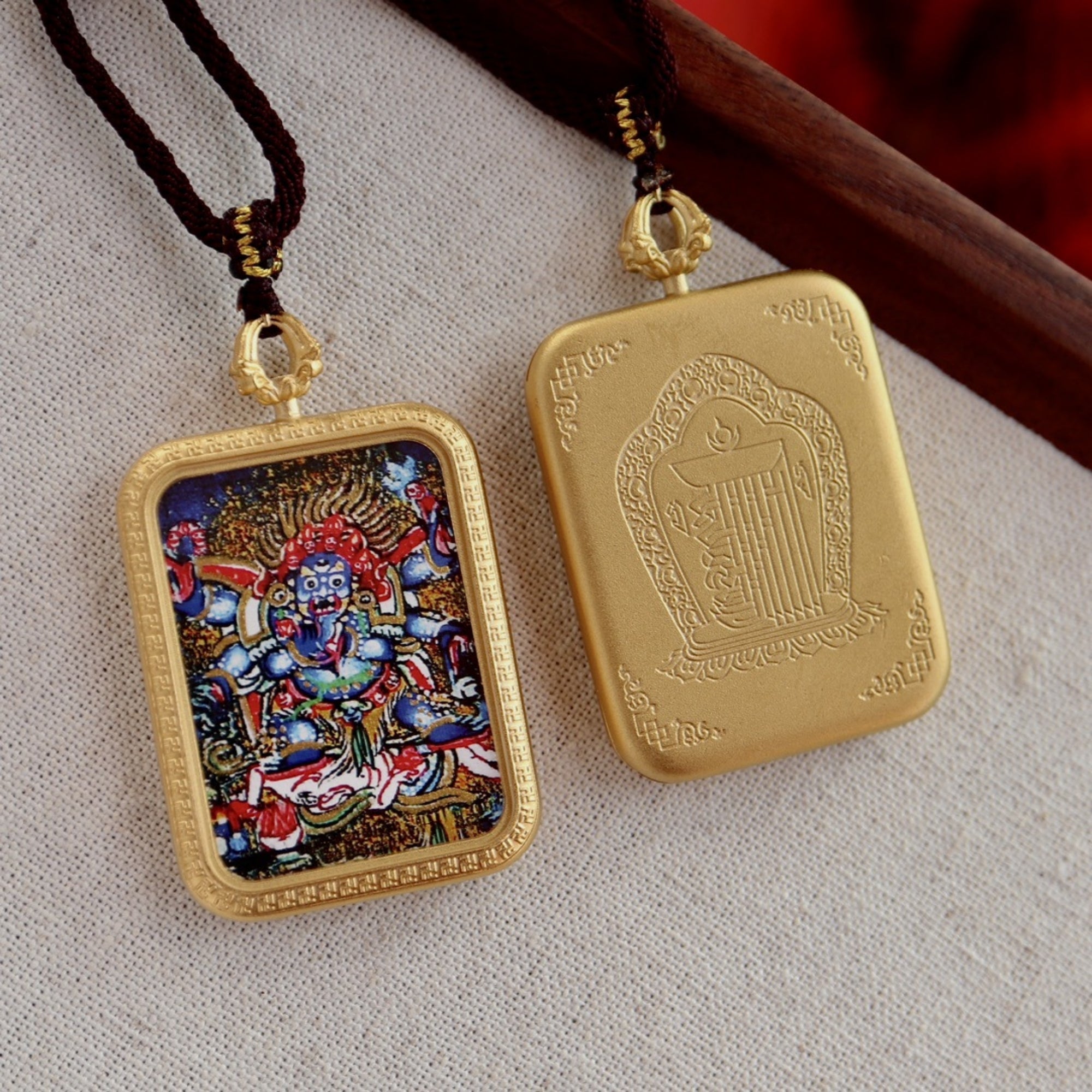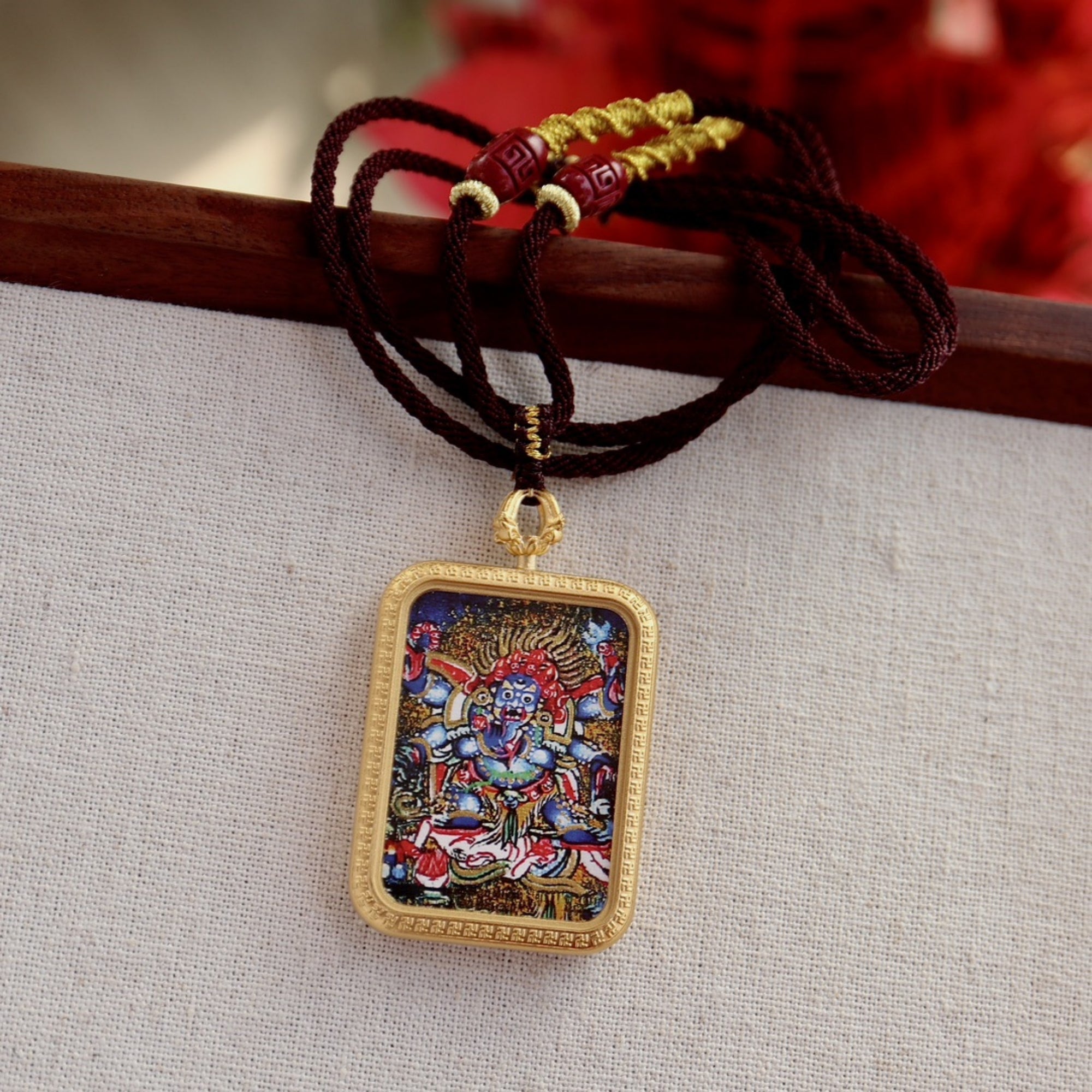 Crafted by Tibetan artisans, this Mahakala Thangka Amulet Necklace channels the unyielding energy of Buddhism’s fiercest protector. Encased in a brass GaWu Box and painted with mineral pigments, it’s a wearable fortress for those who dare to confront life’s chaos head-on.