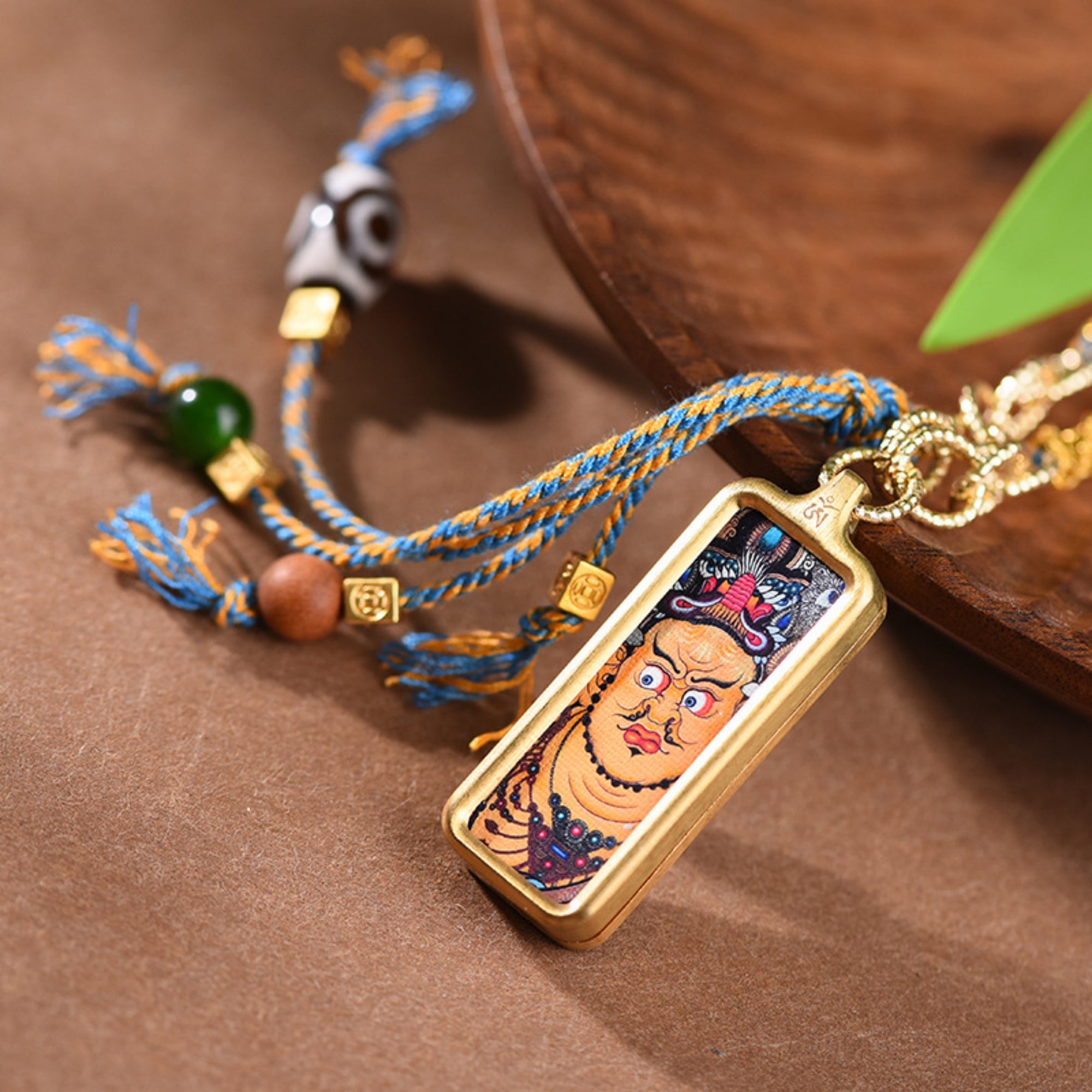 This Tibetan Hand-Painted Thangka Yellow Wealth Deity Necklace is more than just a piece of jewelry; it is a wearable symbol of spiritual protection and a testament to the rich cultural heritage of Tibet.