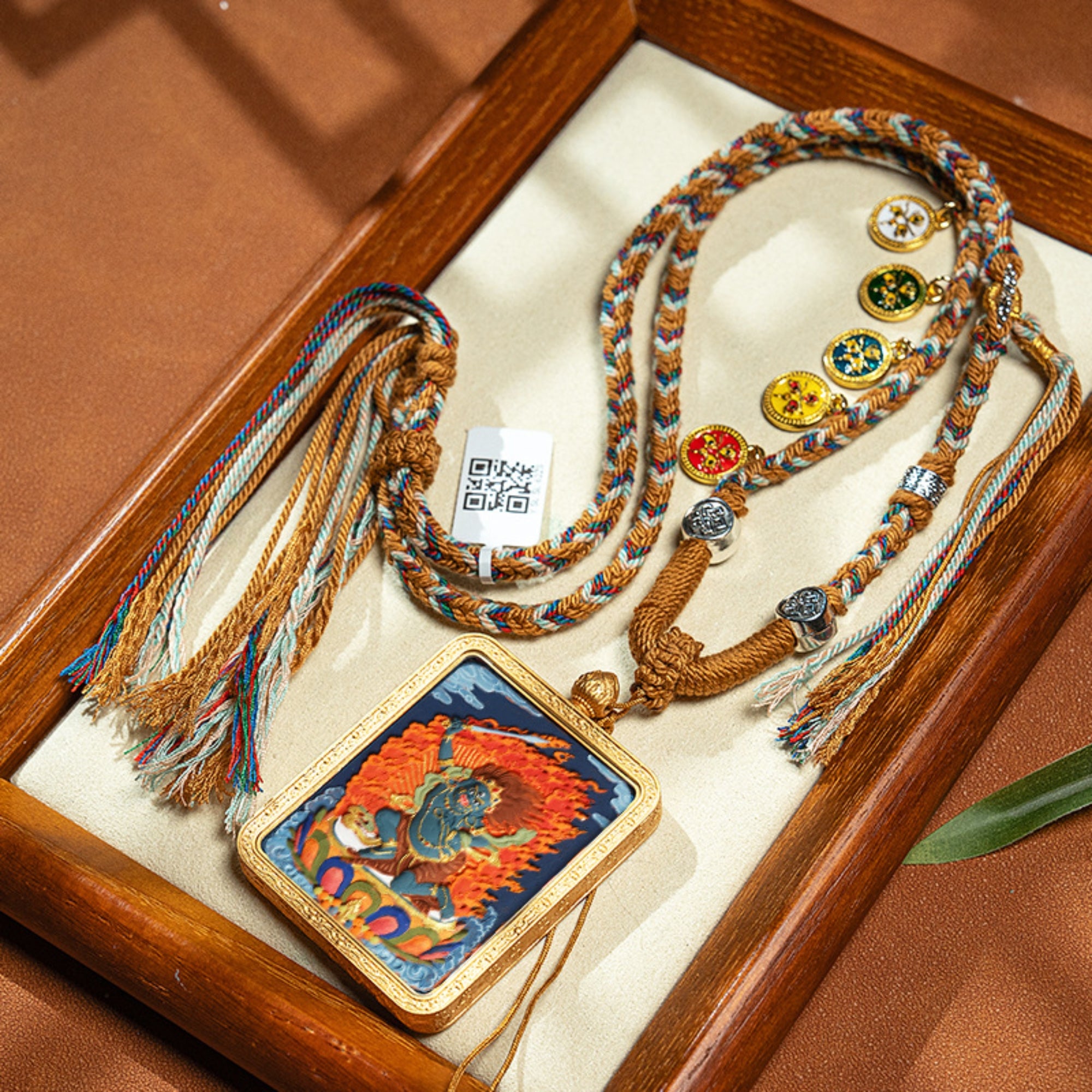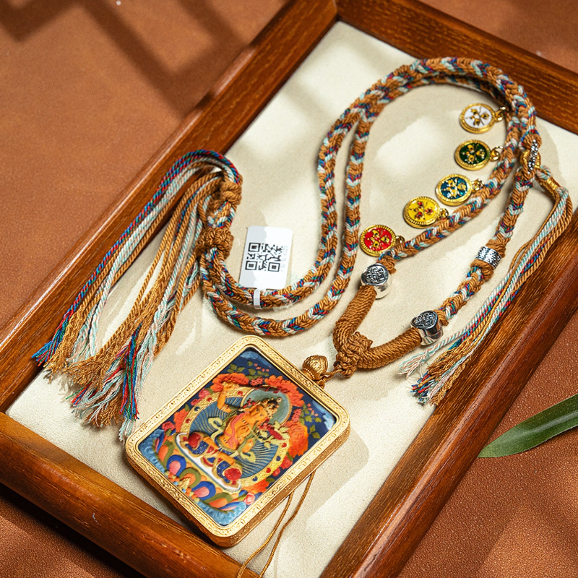 Carry your personal guardian with you every day. This pendant houses a tiny, hand-painted Buddha thangka—each one depicting the deity who protects your Chinese zodiac sign—framed in a solid brass gawu (shrine) box. Measuring 47 mm × 67 mm and weighing 40 g, it has a reassuring heft without feeling bulky. On the back, the six-syllable mantra “Om Mani Padme Hum” is delicately engraved into the brass.