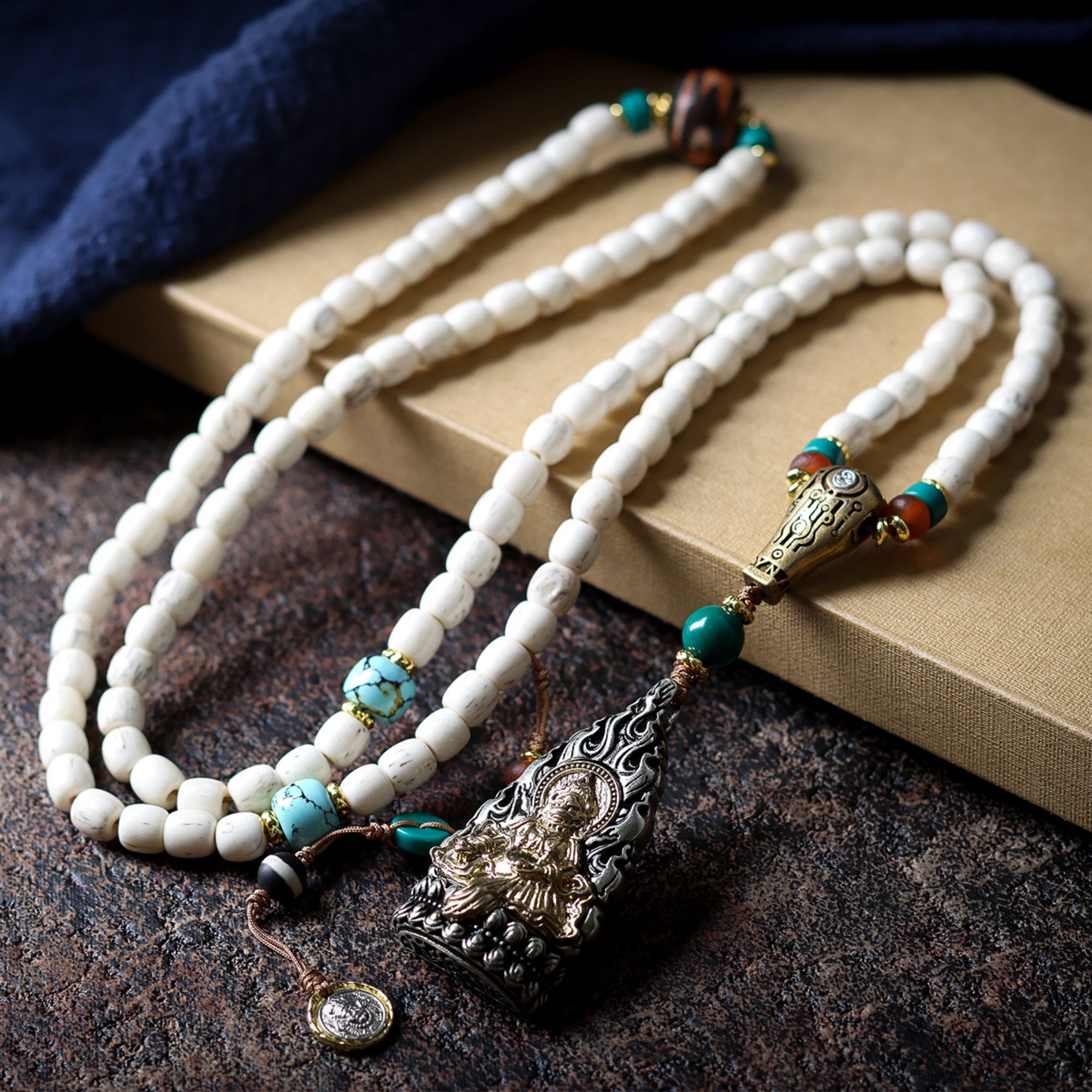 Handcrafted by Tibetan artisans, the Tibetan Yak Bone Bead Yellow Jambhala Necklace is a unique piece that combines traditional materials with spiritual significance. This necklace is made from Tibetan yak bone beads and features a hand-carved Yellow Jambhala pendant, creating a harmonious blend of cultural heritage and artistic craftsmanship. The design is inspired by the Yellow Jambhala, the deity of wealth and prosperity in Tibetan Buddhism, who is believed to bestow blessings of wealth and abundance. The use of yak bone in Tibetan jewelry symbolizes strength and endurance, reflecting the resilience of the Tibetan people and their connection to the land.