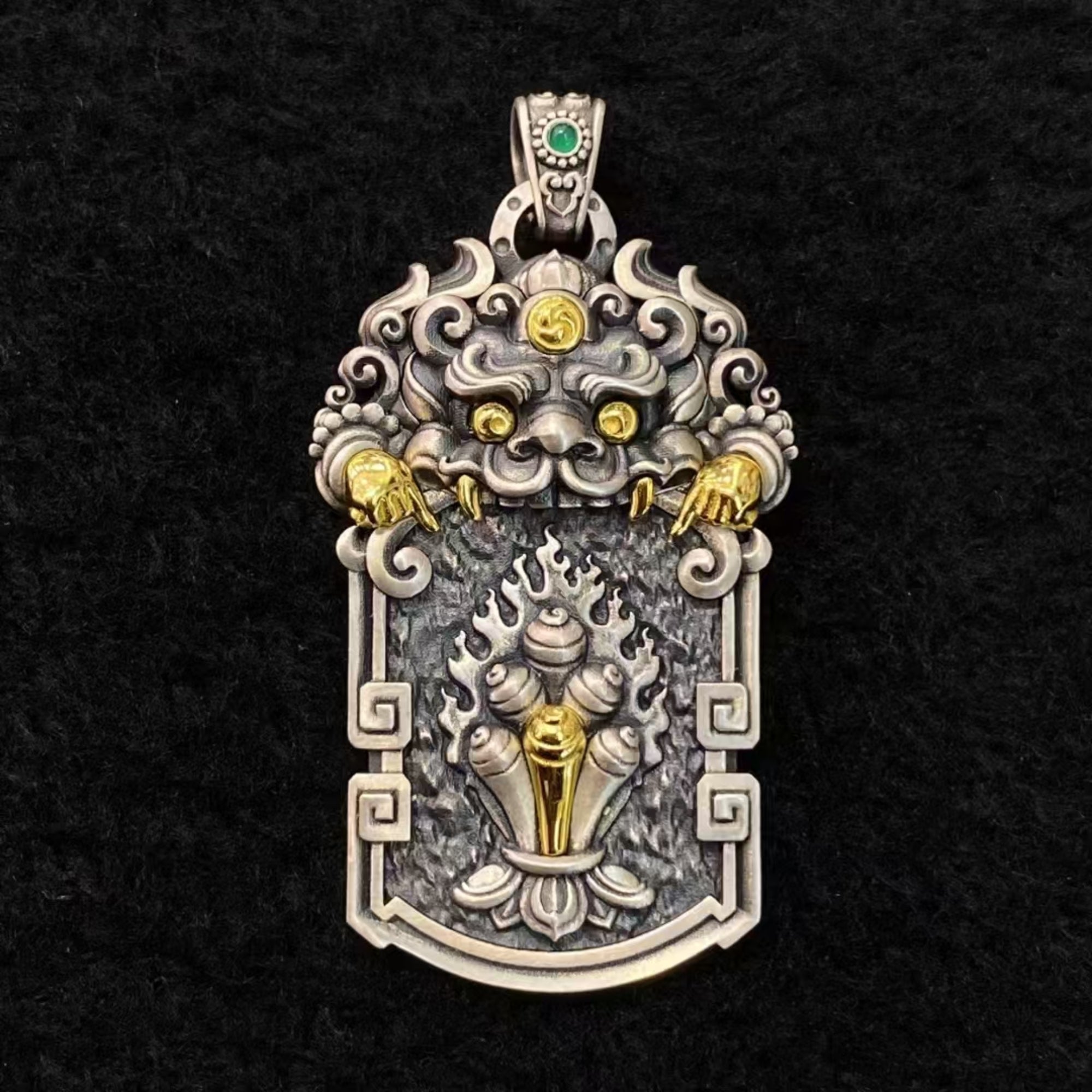 Crafted by Tibetan artisans in S925 silver with gold accents and emerald, this amulet (25x42mm) merges Zhibazha (Tibetan wrathful guardian) and the vajra thunderbolt. Zhibazha – depicted as a cosmic glutton – consumes spiritual parasites, while the vajra fortifies your focus.